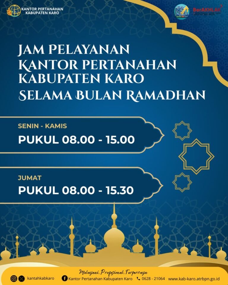 KARO, sorakaro.com Kantor Pertanahan Kabupaten Karo melakukan penyesuaian jam pelayanan kepada masyarakat selama bulan suci...