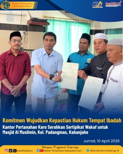 Kantor Pertanahan Kabupaten Karo Serahkan Sertipikat Tanah Wakaf untuk Masjid Al Muslimin Pujakesuma