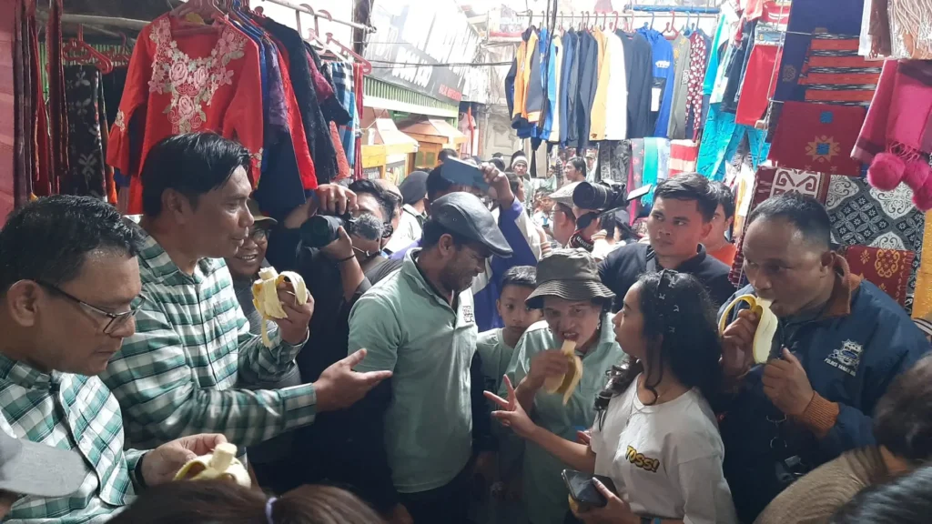 Riuh para pedagang menyambut pasangan Tino Mimana Sinuraya dan Onasis Sitepu dengan sambutan salam 3 jari, sembari mengucap ungkapan “TOSS”.