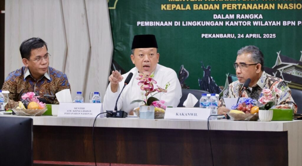 Menteri Agraria dan Tata Ruang/Kepala Badan Pertanahan Nasional (ATR/BPN), Nusron Wahid, menegaskan pentingnya percepatan penataan dan pemetaan pertanahan di Provinsi Riau. Pesan ini ia sampaikan dalam pembinaan kepada jajaran Kantor Wilayah (Kanwil) BPN Provinsi Riau pada Kamis (24/04/2025).