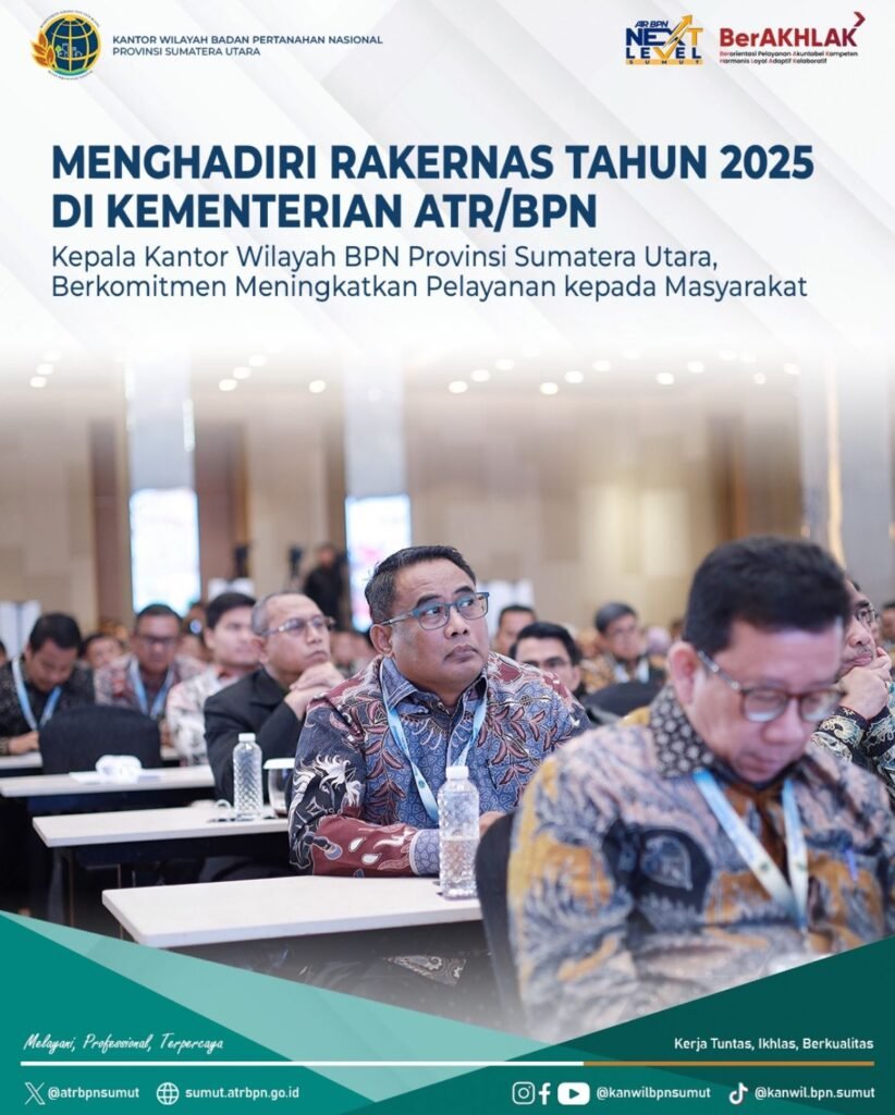 Kepala Kantor Wilayah Badan Pertanahan Nasional Provinsi Sumatera Utara, Bapak Sri Pranoto menghadiri Rapat Kerja Nasional (Rakernas) Kementerian ATR/BPN Tahun 2025, sebuah agenda strategis yang menjadi sarana konsolidasi nasional untuk menyelaraskan kebijakan, mengevaluasi capaian, serta memperkuat arah pembangunan pertanahan dan penataan ruang di Indonesia.