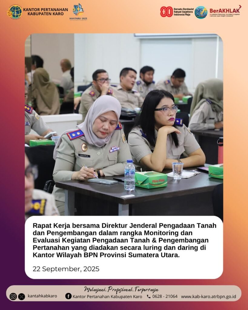 Kepala Kantor Pertanahan Kabupaten Karo, Ibu Nhora Herawaty Saragih, S.ST., M.Si., bersama Kepala Seksi Pengadaan Tanah dan Pengembangan, turut serta dalam Rapat Kerja yang diselenggarakan oleh Kantor Wilayah Badan Pertanahan Nasional (BPN) Provinsi Sumatera Utara, Senin (22/09/2025) bersama Direktorat Jenderal Pengadaan Tanah dan Pengembangan Pertanahan.