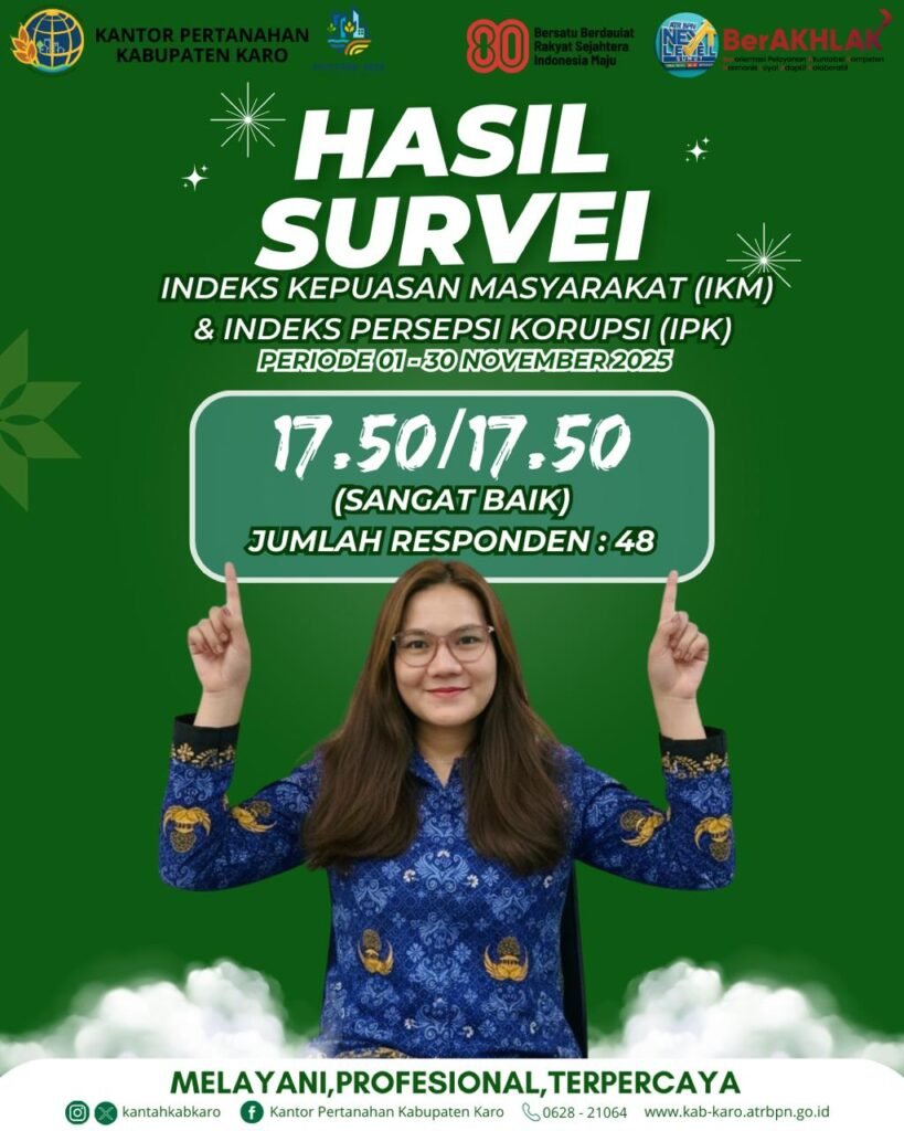 Kantor Pertanahan Kabupaten Karo kembali menunjukkan komitmennya dalam memberikan pelayanan terbaik kepada masyarakat. Pada pelaksanaan Survei Indeks Kepuasan Masyarakat (IKM) dan Indeks Persepsi Korupsi (IPK) periode November, Kantah Karo berhasil meraih predikat “Sangat Baik”, sebuah capaian yang mencerminkan peningkatan kualitas layanan dan integritas aparatur pertanahan di daerah tersebut.