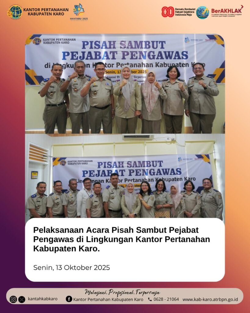 Kantor Pertanahan Kabupaten Karo menggelar acara pisah sambut pejabat pengawas bertempat di aula kantor setempat. Acara ini dilaksanakan sebagai bentuk apresiasi atas pengabdian pejabat lama sekaligus menyambut pejabat baru yang akan mengemban tugas di lingkungan Kantor Pertanahan Kabupaten Karo Senin (13/10/2025).