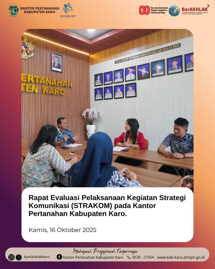 Dalam upaya memperkuat efektivitas penyampaian informasi dan meningkatkan kualitas pelayanan publik, Kantor Pertanahan Kabupaten Karo menggelar Rapat Evaluasi Pelaksanaan Kegiatan Strategi Komunikasi (STRAKOM), Kamis (16/10/2025).