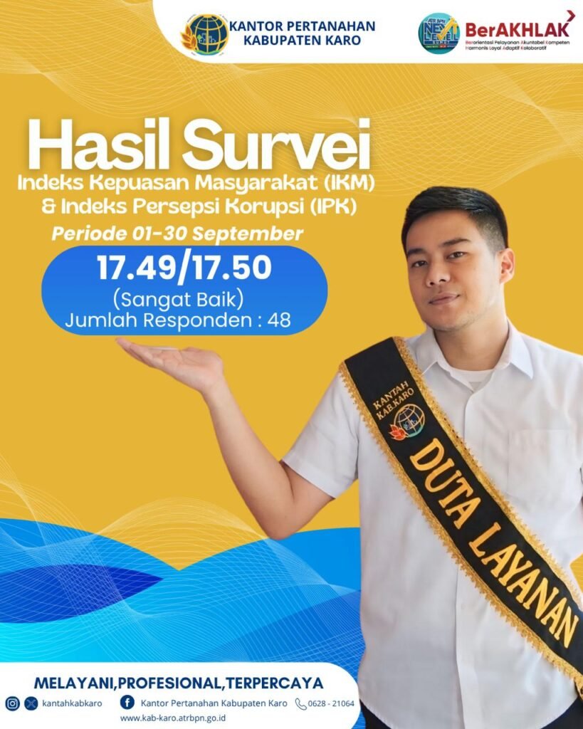 Kantor Pertanahan Kabupaten Karo kembali menunjukkan komitmennya dalam memberikan pelayanan terbaik kepada masyarakat. Hal ini dibuktikan dengan capaian Indeks Kepuasan Masyarakat (IKM) dan Indeks Persepsi Korupsi (IPK) tahun 2025 yang memperoleh predikat “Sangat Baik”, Rabu (01/10/2025).