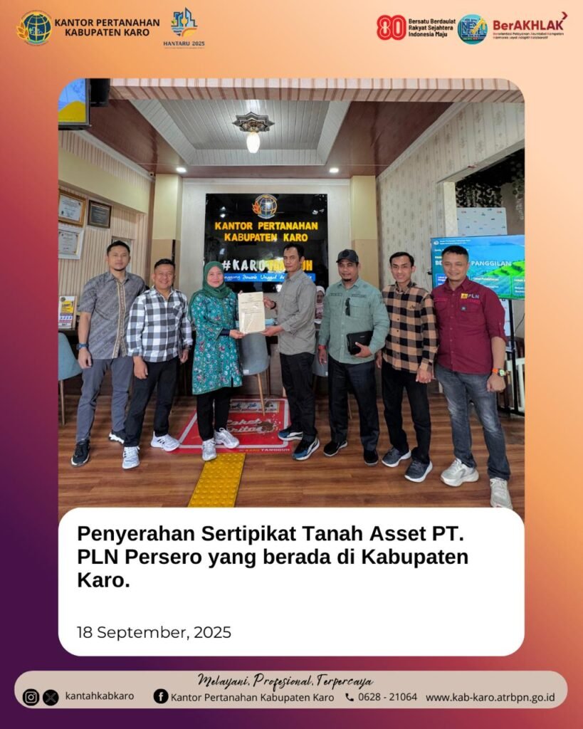 Kantor Pertanahan Kabupaten Karo melaksanakan kegiatan Penyerahan Sertipikat Tanah Aset milik PT PLN (Persero), bertempat di Aula Kantor Pertanahan Kabupaten Karo, Rabu (18/09/2025).