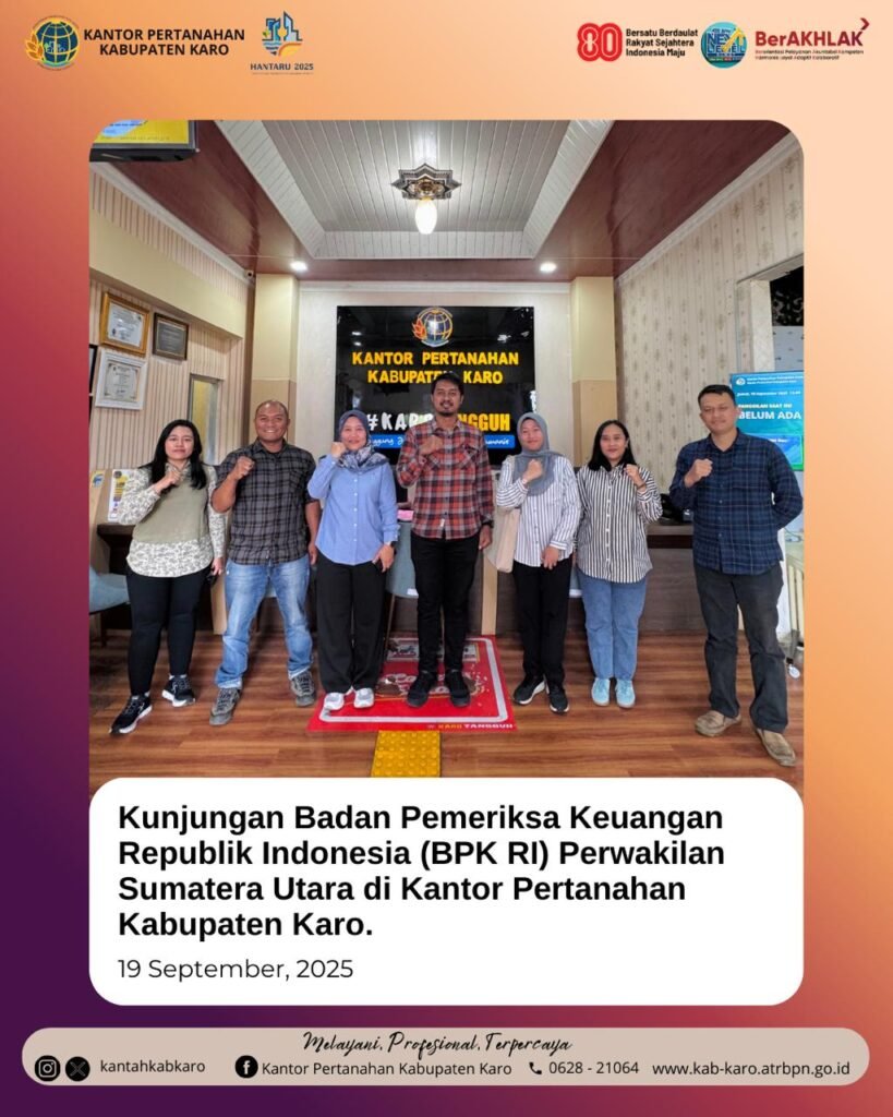 Kantor Pertanahan Kabupaten Karo menerima kunjungan dari Badan Pemeriksa Keuangan Republik Indonesia (BPK RI) Perwakilan Provinsi Sumatera Utara pada Jumat (19/09/2025). Kunjungan ini dilaksanakan dalam rangka Pemeriksaan Kinerja atas Upaya Pemerintah dalam Meningkatkan Ketahanan Pangan.