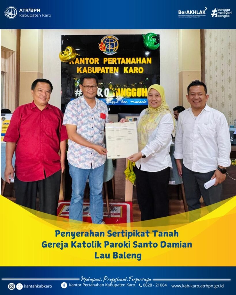 Kepala Kantor Pertanahan Kabupaten Karo, Ibu Nhora Herawaty Saragih, S. ST., M.Si. didampingi Kepala Seksi Penetapan Hak dan Pendaftaran Kantor Pertanahan Kabupaten Karo Menyerahkan Sertipikat Tanah Gereja Katolik Paroki Santo Damian Lau Baleng, atas tanah yang terletak di Desa Kinangkong Kecamatan Lau Baleng dan Desa Lau Peranggunen Kecamatan Lau Baleng Pada Selasa (08/04/25).