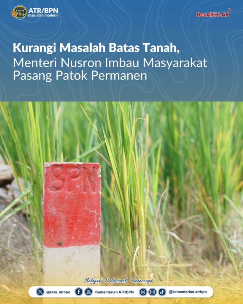Menteri Agraria dan Tata Ruang/Kepala Badan Pertanahan Nasional (ATR/BPN), Nusron Wahid, mengimbau masyarakat untuk memasang patok batas tanah dengan bahan yang permanen, seperti beton, kayu, atau besi. Langkah ini dinilai penting untuk mengurangi konflik pertanahan, khususnya yang berkaitan dengan batas fisik lahan.