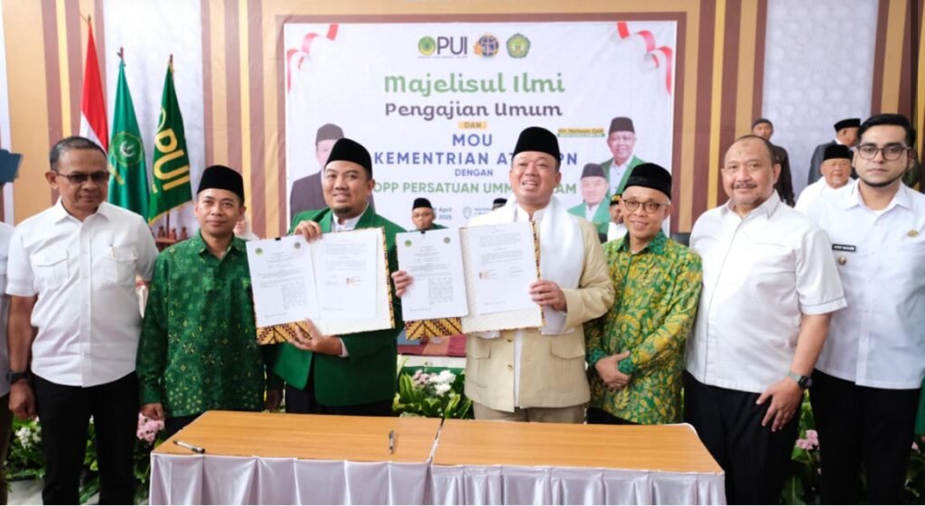 Menteri Agraria dan Tata Ruang/Kepala Badan Pertanahan Nasional (ATR/BPN), Nusron Wahid, menandatangani Nota Kesepahaman (MoU) yang meresmikan kerja sama dengan Dewan Pimpinan Pusat (DPP) Persatuan Ummat Islam (PUI), di Pondok Pesantren Syamsul ‘Ulum, Kota Sukabumi, Rabu (16/04/2025). Dalam sambutannya, Menteri Nusron menekankan pentingnya pemanfaatan tanah secara produktif untuk kemakmuran rakyat, termasuk tanah-tanah wakaf.