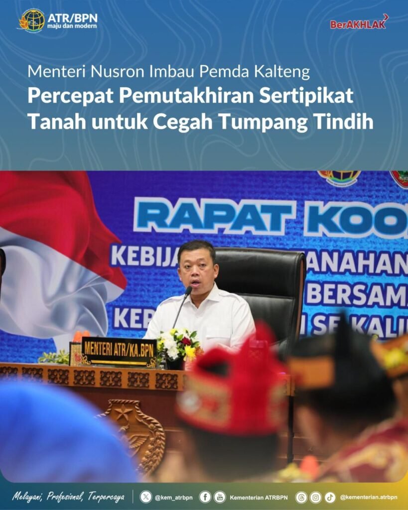 Menteri Agraria dan Tata Ruang/Kepala Badan Pertanahan Nasional (ATR/BPN), Nusron Wahid, meminta pemerintah daerah (Pemda) se-Kalimantan Tengah (Kalteng) untuk mengambil langkah cepat dalam mencegah potensi tumpang tindih sertipikat. Instruksi itu disampaikan saat memimpin Rapat Koordinasi Kebijakan Pertanahan dan Tata Ruang bersama kepala daerah se-Kalimantan Tengah tahun 2025, Kamis (11/12/2025).