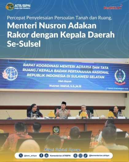 Nasional | • 13 November 2025 • Percepat Penyelesaian Persoalan Tanah dan Ruang, Menteri Nusron Adakan Rakor dengan Kepala Daerah Se-Sulsel Makassar, sorakaro.com Menteri Agraria dan Tata Ruang/Kepala Badan Pertanahan Nasional (ATR/BPN), Nusron Wahid, memimpin Rapat...