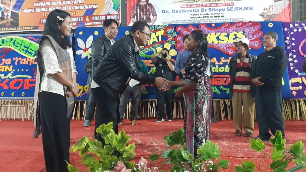 Selain bangga dengan penampilan kreasi budaya dari anak-anak paud yang ditampilkan dalam acara kerja tahun (pesta tahunan) desa gurukinayan, Kamis (17/10/2024), pasangan calon Bupati dan Wakil Bupati Karo, Tino Mimana Sinuraya dan Onasis Sitepu beri hadiah kepada dua siswa berprestasi.
