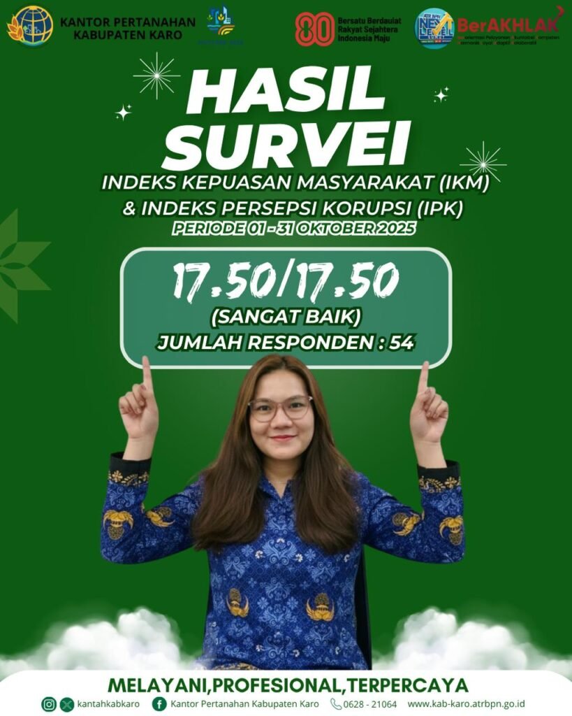 Upaya peningkatan kualitas pelayanan publik yang dilakukan Kantor Pertanahan Kabupaten Karo membuahkan hasil membanggakan. Berdasarkan hasil Survei Indeks Kepuasan Masyarakat (IKM) dan Indeks Persepsi Korupsi (IPK) periode Oktober 2025, Senin (03/11/2025) Kantor Pertanahan Kabupaten Karo berhasil meraih predikat “Sangat Baik”.