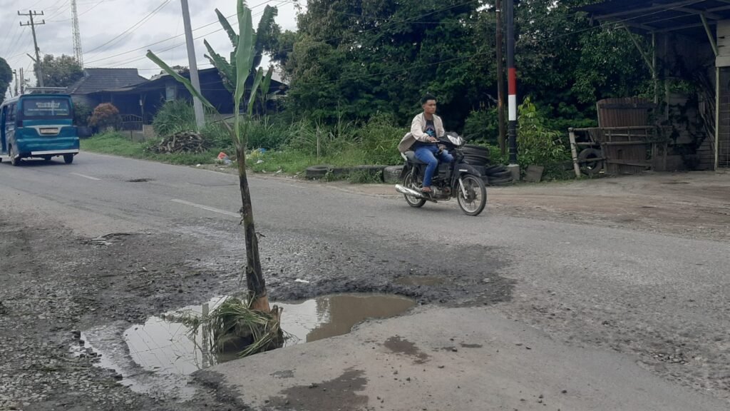 Penampakan Jalan Nasional Kabanjahe-Kotacane Ditanami Pohon Pisang