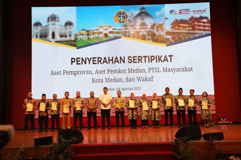 Dalam kesempatan ini, Kanwil BPN Provinsi Sumatera Utara menyerahkan Sertipikat Tanah untuk Pemerintah Provinsi Sumatera Utara, Sertipikat Tanah untuk Pemerintah Kota Medan, Sertipikat Tanah hasil Program PTSL, dan Sertipikat Tanah Wakaf.