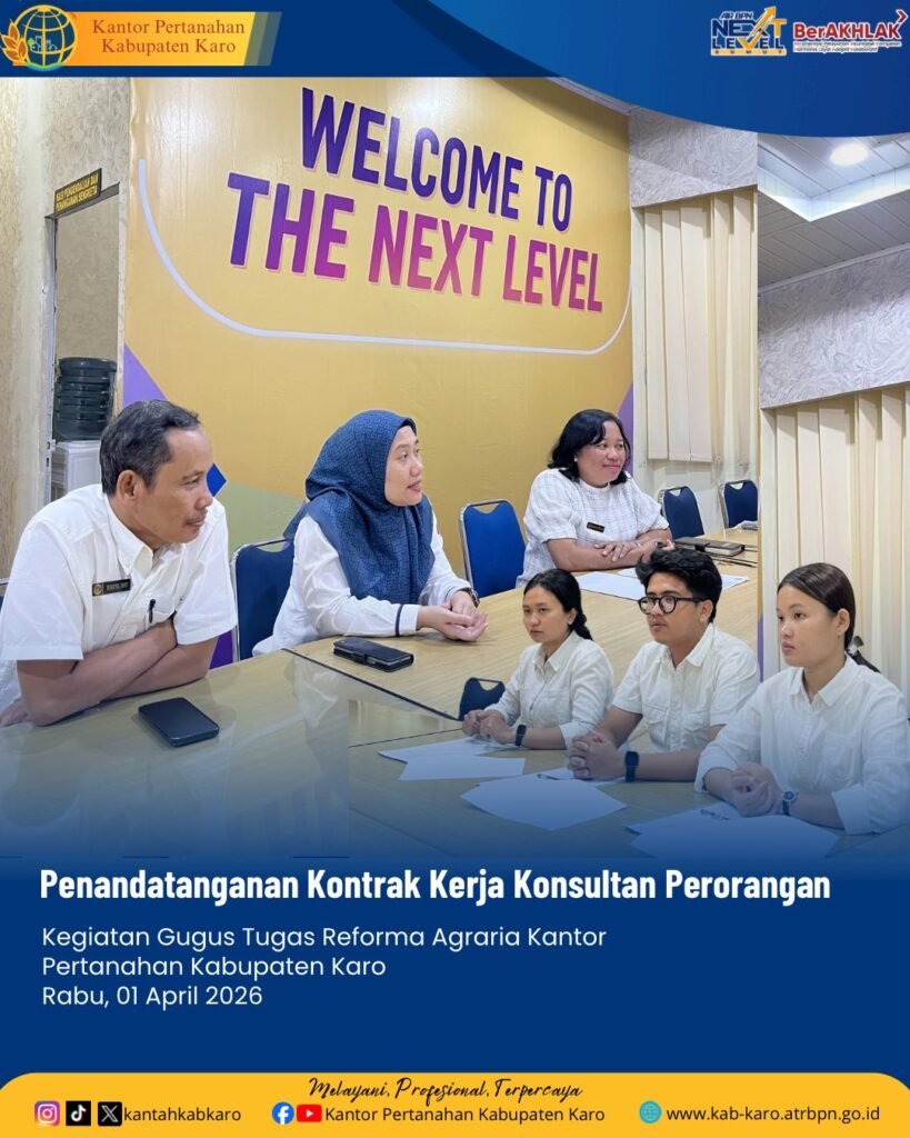 Kantor Pertanahan Kabupaten Karo melaksanakan kegiatan penandatanganan kontrak kerja bagi konsultan perorangan pada Selasa (01/04/2026) sebagai bagian dari upaya meningkatkan kualitas pelayanan pertanahan kepada masyarakat. Kegiatan ini berlangsung di Kabanjahe dalam suasana tertib dan penuh komitmen profesional.