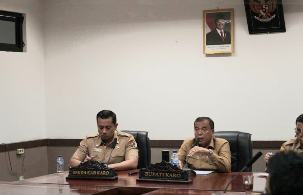 Bupati Karo, Brigjen Pol (Purn) Dr. dr. Antonius Ginting, Sp.OG., M.Kes memimpin langsung rapat persiapan Peringatan Hari Jadi Kabupaten Karo ke-80 Tahun 2026 yang digelar di Ruang Rapat Matang Sitepu, Kantor Bupati Karo, Senin (23/02/2026).