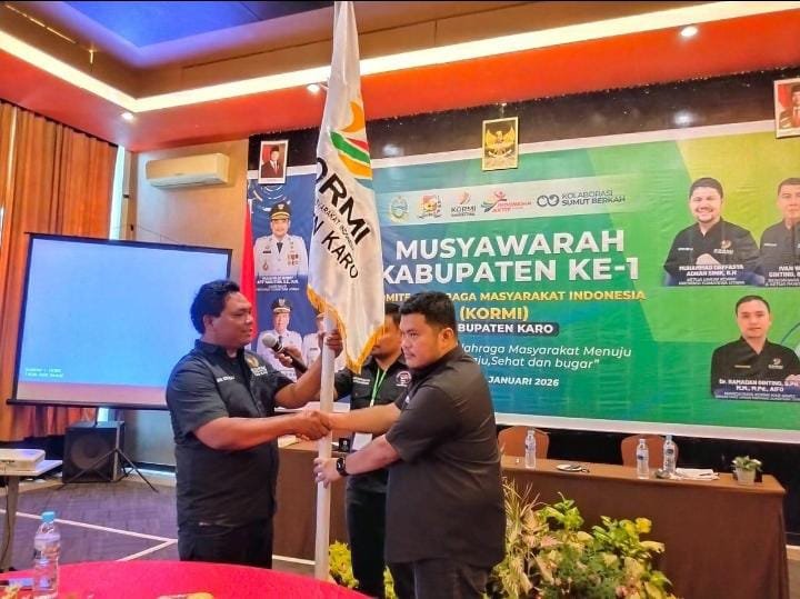 Melalui Musyawarah Kabupaten, Maha Sendi Milala resmi jabat Pimpinan Komite Olahraga Masyarakat Indonesia (KORMI) Kabupaten Karo untuk periode 2026-2030 di Gedung Hotel Mikie Holiday, Berastagi, Sabtu (18/01/2026).