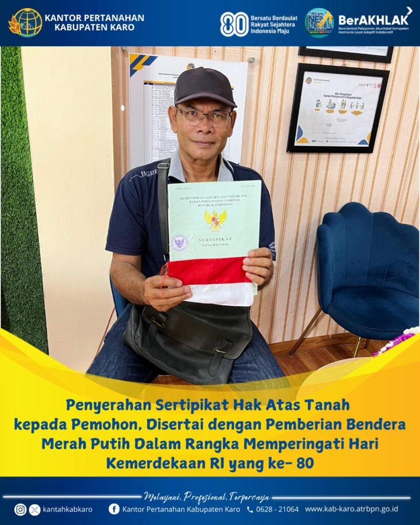 Dalam rangka memperingati Hari Ulang Tahun ke-80 Kemerdekaan Republik Indonesia, Kantor Pertanahan Kabupaten Karo melakukan penyerahan sertipikat hak atas tanah kepada pemohon, disertai dengan pemberian Bendera Merah Putih sebagai simbol cinta tanah air dan semangat nasionalisme, Kamis (14/08/2025).